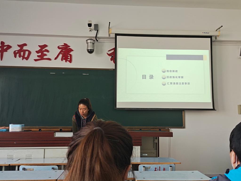 然后,修欣老师进行了全员集体培训。培训的主要内容:一是税收新政,对增值税、企业所得税和个人所得税政策变化,分类分条进行解读;二是旧政强化掌握,根据学校实际情况重点举例说明小规模增值税及附征税收优惠政策;三是汇算清缴注意事项,针对申报流程、申报表填报及申报注意事项进行讲解,确保申报及时准确。